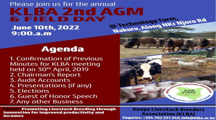 KLBA plans to host the 2nd Annual General Meeting of owners of registered and milk recorded livestock on 10th June 2022. The AGM shall be held at Technology Farm, Nakuru